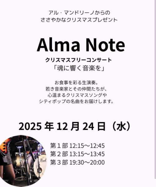 アルマンドリーノから続けてコンサートのお知らせです。12月24日にご予約のお客様に向けて、クリスマス...
