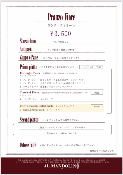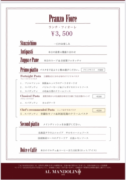 広島市 平和公園近くのイタリアこ料理「アル・マンドリーノ」です。本日は11/11からのランチメニュー内...
