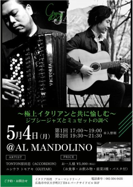 ゴールデンウィークの営業をご案内いたします。5月4日の夜はジプシージャズとミュゼットの演奏会を開催...